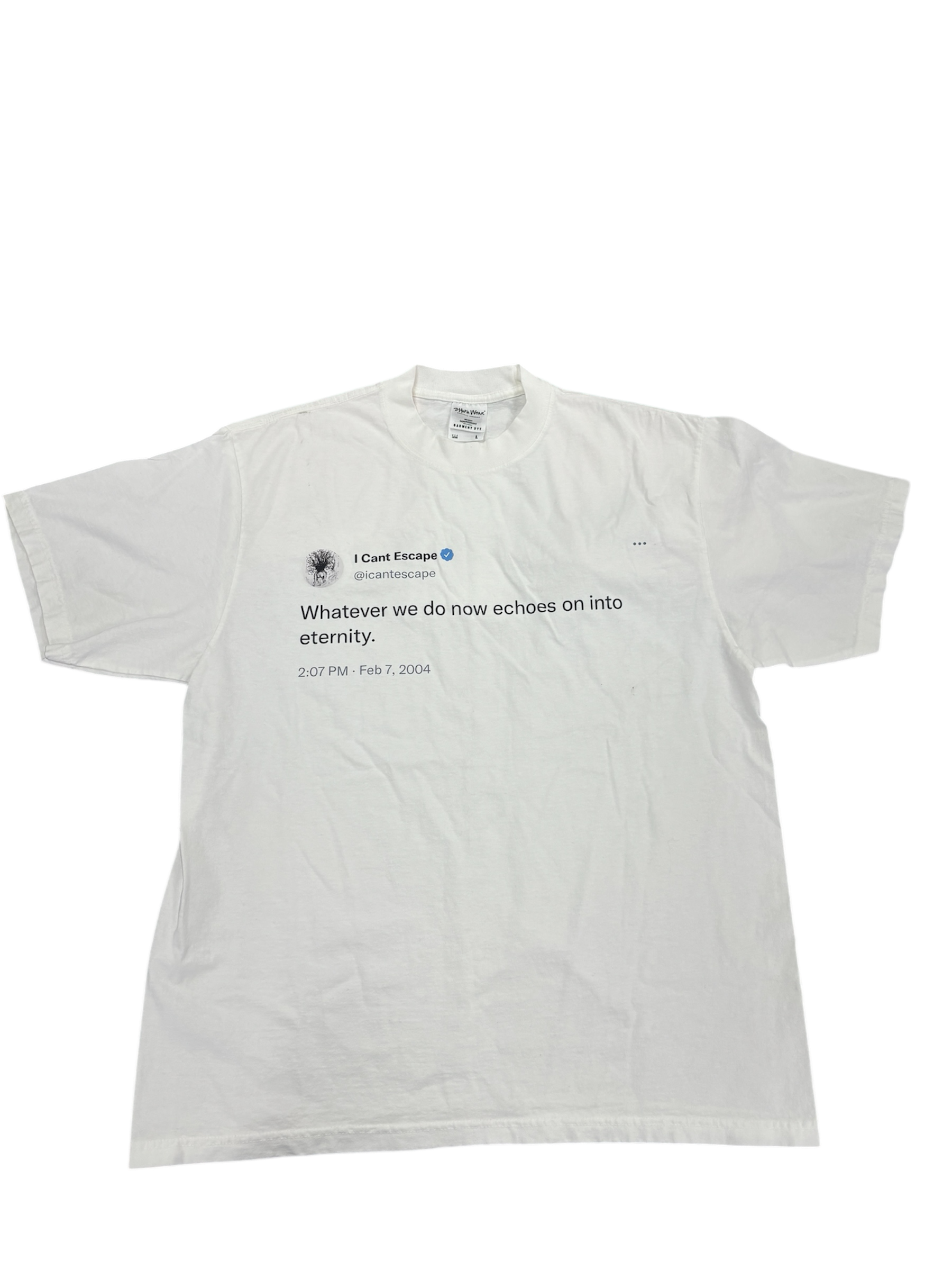 This White T from I Can’t Escape blends modern digital culture with timeless philosophy. Designed to resemble a tweet, the front of the shirt features the phrase: